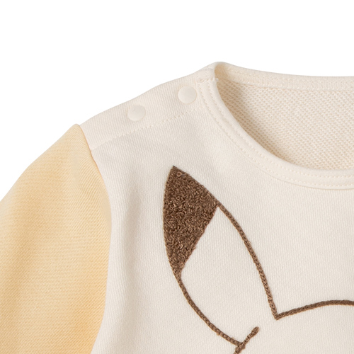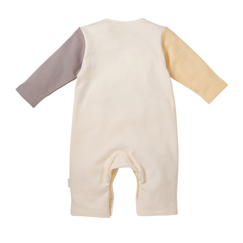 袖や身頃のカラーがそれぞれ違うクレイジー配色が楽しいロンパースです。