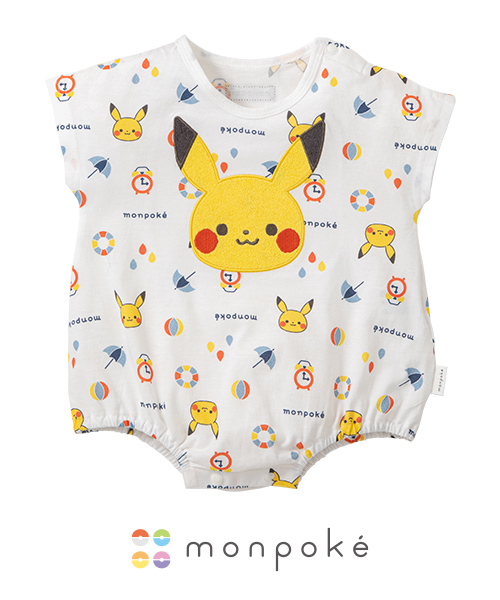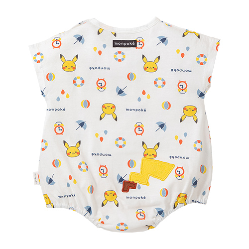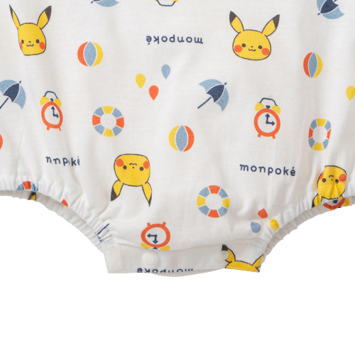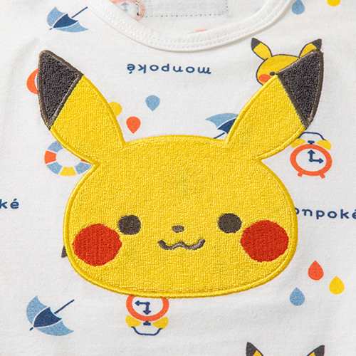 ピカチュウの顔のアップリケ刺繍が入った半袖ロンパース。