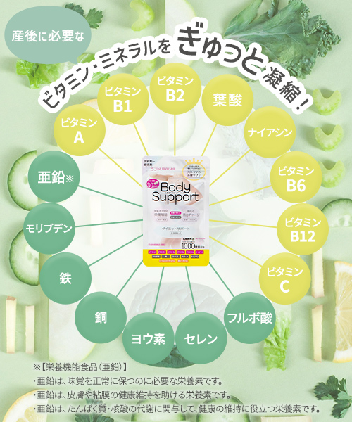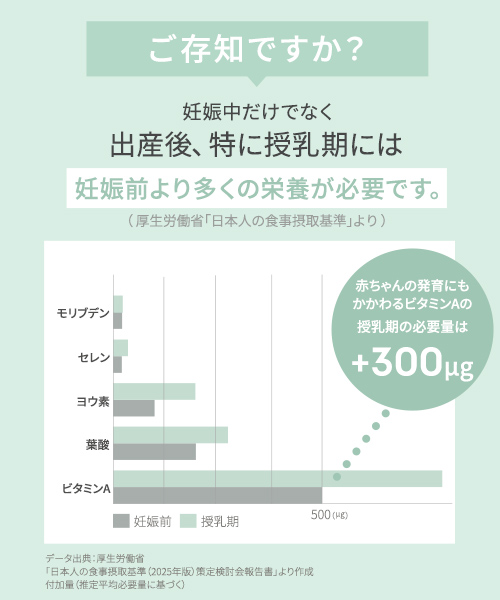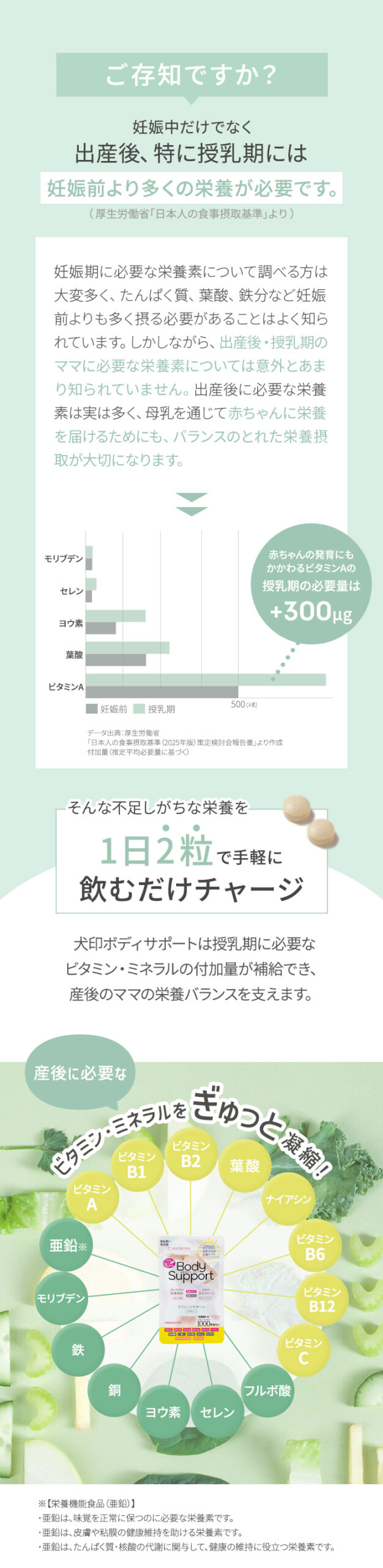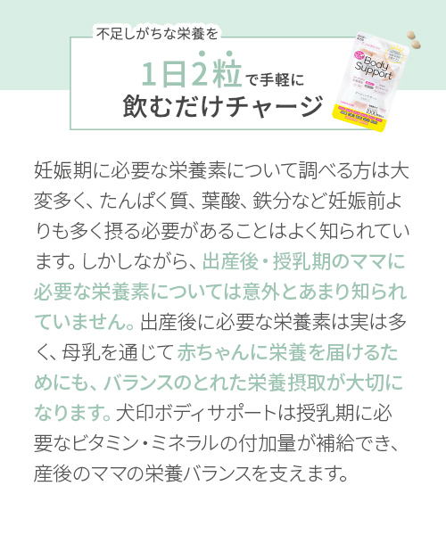1日2粒で産後に意識したいビタミン・ミネラルや日々の栄養を手軽に補える。