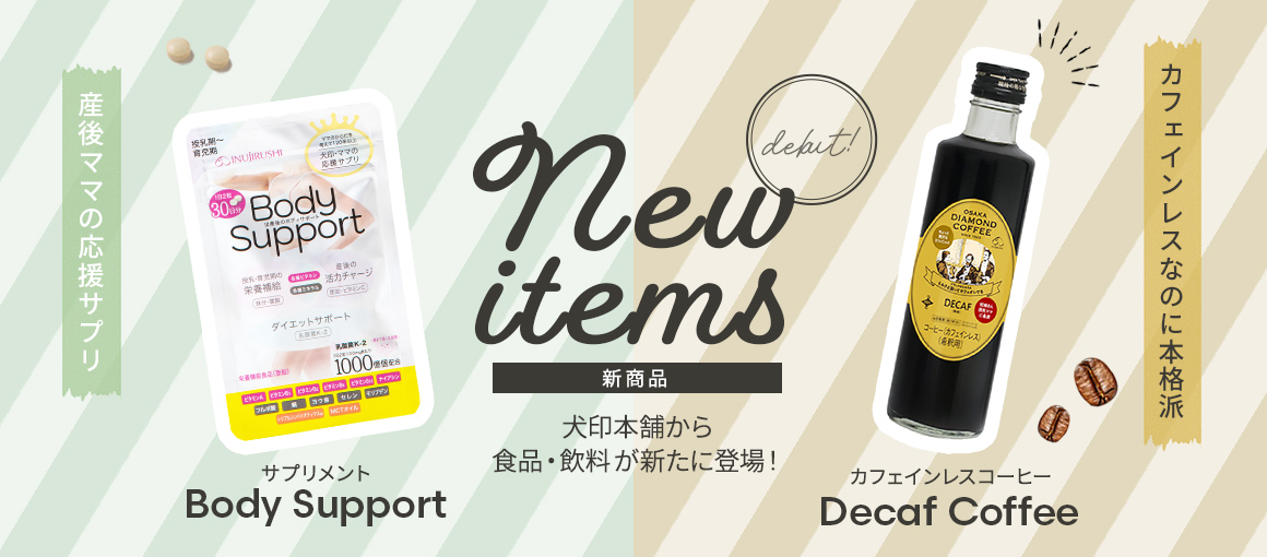 犬印本舗から授乳期から飲める「産後サプリメント」と 妊娠中でも安心&本格的な味わい「カフェインレスコーヒー」が新登場。 ご購入はこちらから