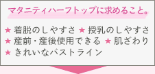 ハーフトップに一番求められていることは、授乳がしやすいこと!ハーフトップは使用期間が長く、出産前から授乳期まで使えます。今回は特に出産後の授乳になれた時期からの外出にも使える、そんなハーフトップがモニターさんの声から生まれました。